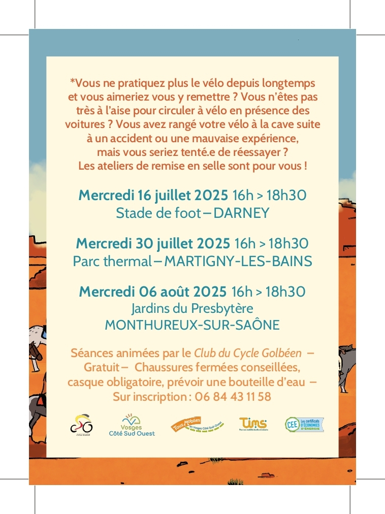Nous animerons cet été 3 ateliers Remise en Selle sur le territoire de la communauté de commune Des Vosges Côté Sud Ouest.